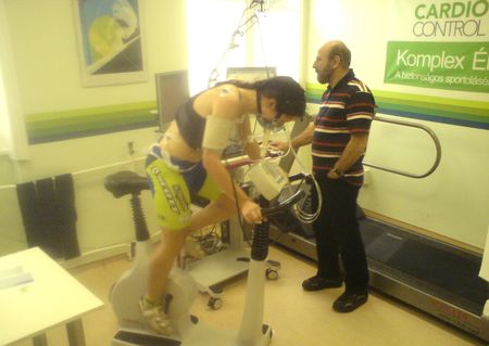 Az egész vizsgálat felvezető része a legmókásabb, a “bedrótozás” miatt. Ugyanis ún. terheléses EKG vizsgálat zajlik a tekerés közben, amiből egy laikus kb. annyit lát, hogy egy halom tappancs és színes vezeték indul ki a delikvensből, s jut el a számítógépbe, amely monitorján nem sok dolog maradhat így rejtve…